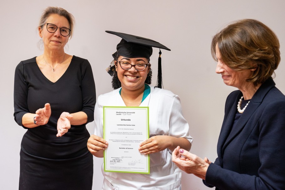 Die Übergabe der Urkunden und die Anerkennung des akademischen Grades Bachelor of Science erfolgte durch die Pflegevorständin Andrea Stewig-Nitschke und die Gründungsvorständin Wissenschaft der MUL-CT, Prof. Dr. Adelheid Kuhlmey.